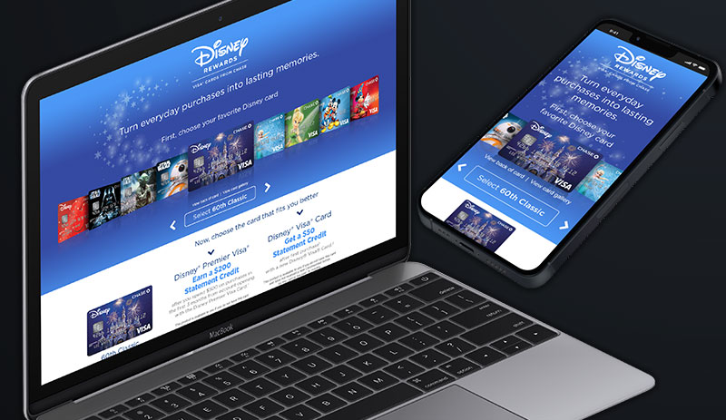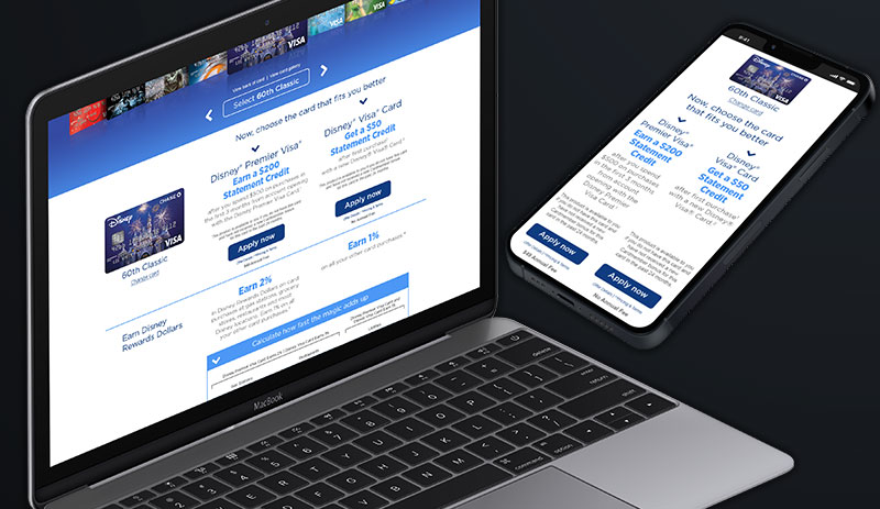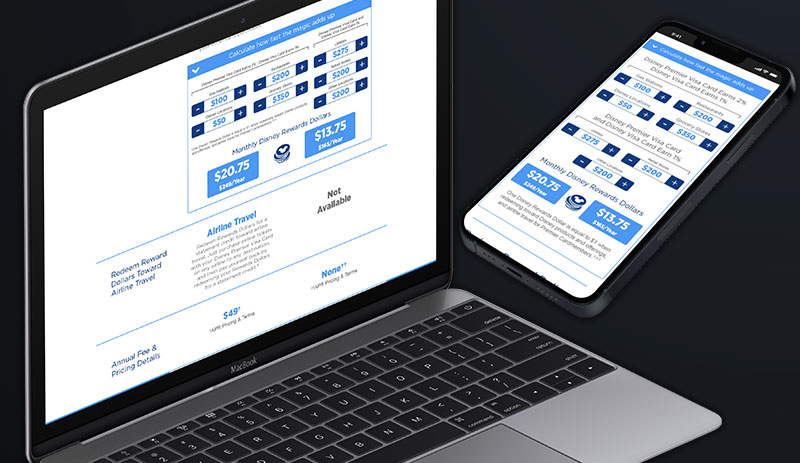 Disney is one of the most recognizable and beloved brands in the world so it was critical to make the brand sing to connect potential cardholders to the Disney experience. To achieve the acquisition goals, the UI and UX embraced the brand ethos and was deliberately simple, smart and actionable. One key behavior of the target audience was the pride they felt when presenting their iconic Disney character credit card at the time of purchase. To connect users to this feeling, cards were heroically showcased so a customer could choose their iconic Disney card, bringing them a step closer to applying. In addition to listing all the benefits of being a cardholder, a points calculator helped to make the benefits more relevant and obtainable based on a cardholder’s spending habits.